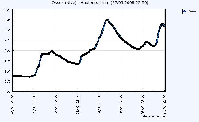 Malgré mes prévisions espérances des billets précédents, la Nive joue au yoyo, (je devrai plutôt écrire yeauyeau) depuis 1 semaine. Vas-y que je monte à 2 m, que je redescende à 1,5, que je culmine à 3,5 pour descendre à 1m/jour jusqu’à 2m, laissant entrevoir un week-end pêche, et que, suite aux précipitations de ces jours-ci, je remonte à 3,2 m pour redescendre selon le graphe, mais avec la pluie qui tombe encore à cette heure-ci, je crois que les carottes sont cuites. A 1m/jour, il faudra en gros 3 jours pour retrouver un niveau halieuticompatible, mais sans voir la pluie. Donc rien de possible à la mouche avant dimanche soir. Samedi ou Dimanche peuvent être bon au ver ou à la grenade. Avis aux amateurs. 10 truites dimanche soir au congèl’ ! C’est ton cas ? … Change de blog non ?