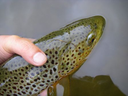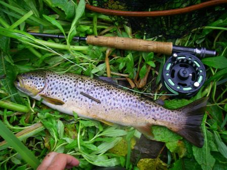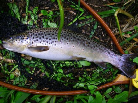 Je toucherai en tout 16 poissons, dont 5 décrochés – 2 au ferrage, 3 en combat-(hameçon barbless ?). Les mensurations des plus gros : 50 (cf plus haut), 47, 46, 42 … Un vrai régal malgré la couleur toujours chocolat clair de la rivière. Ces poissons seront touchés sur 200 m de rivière, sur la partie la plus … publique (en bordure d’un lotissement).