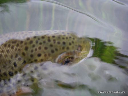 Je suis bien placé un peu en aval, sur un promontoire rocheux, un petit lancer sans difficulté. Première dérive, deuxième … Je ne pêche pas assez mou. J’oriente ma canne un peu plus vers le bas pour faire un lancer très courbe. La mouche tombe bien…. et dérive sur la bonne zone. Au ralenti, la truite goba mon imitation. En accéléré je ferrerai, avec une magnifique et immédiate casse au niveau du noeud du porte-pointe.