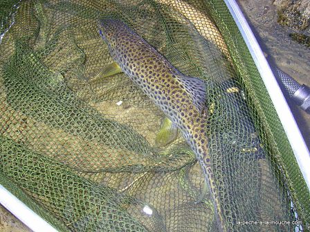 Il a plu jusqu’a midi me dit un très jeune pecheur. Pas de vent. Les conditions me plaisent. J’attaque mon spot. Cinquieme passage sur un bord de berge et une belle fario monte. Ferrage raté. ça commence bien (elles sont dehors). La partie de peche de l’après midi se resumera a cinq décrochages, six ferrages dans le vide et cinq belles farios de sortis (de 25 a 30 cm). La moitié de la partie de peche s’est deroulée au sec l’autre sous une pluie fine qui n’a pas cessé jusqu’a la fin. Pas d’incidence sur l’activité des truites. Certaines gobaient, pour d’autres, il a fallu les tenter en prospectant les postes. La seche, une araignée de 18, corps herl de vautour, hackle roux et gris… Pas un pecheur en vue, le calme, des truites bref une sortie comme je les aime. J’oubliais, a deux reprises alors que j’avançais dans l’eau jusqu a mi cuisse j’ai eu droit a deux gobages juste sous la pointe de ma 9 pieds. Une approche soignée (je doute !!) des truites en folie après leur casse croute surement…Il y a des fois comme ça.
