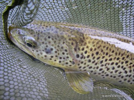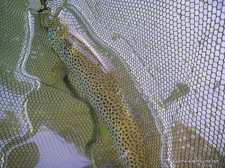 Bref. Ma mouche attend, moi aussi. Elle ne vient pas … elle gobe plus loin. Je récupère mon émergente, et la sèche un peu. Attendre que la truite se montre à  nouveau… elle regobe, je relance, à  une 20aine de cm de sa position …. gobage !