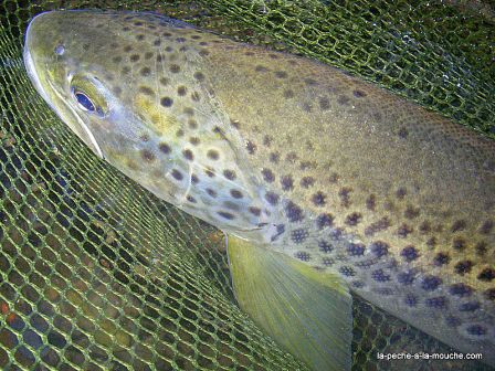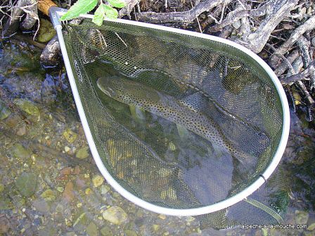 Le vent, le courant, la truite et ma concentration se sont unis et m’offrirent ces 3 ou 4 secondes d’adrénaline. L’extase commenca, l’apnée du moucheur aussi dès que je vis que la mouche se posa bien. Mending amont … elle n’a pas dragué … elle est toujours “naturelle” … le courant ne change pas … autre mending amont … limite … je crois avoir décelé un léger dragage … GOBAGE ! ferrage dans le tempo, concentration oblige -ce n’est pas toujours ma qualité première-. Et la … spectacle ! en vidant ma soie, elle se jette logiquement dans l’amas de bois morts. Je la bride (merci Mirage). Tout tient bien, ma canne aussi, frêle soie de 4 TFO. La truite est freinée et file vers l’aval. A droite, à  gauche, vers moi, plus en aval. Stationnaire, redémarrage, sauts, resauts … j’essaye de lui faire peur en me mettant entre elle et les eaux profondes qu’elle cherche à  rejoindre. Plusieurs fois elle foncera vers moi, et repartira apeurée. Un poisson de 46 cm qui se bat autant, c’est énorme.