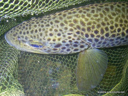 quelques mètres plus loin … une belle truite somnole sur des racines immergées, et gobine mollement ce que lui apporte le courant. Seule possibilité : un lancer arbalète par l’amont, en restant caché dans la végétation. Je ferai monter la belle qui gobera et que je piquoterai juste au ferrage. Pêcheur 1 – Truites 1 !