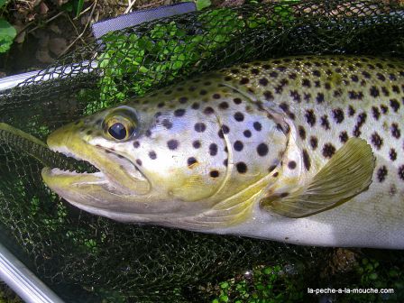 Je ferai probablement une dizaine de passages avec ma mouche d’Ornans avant le gobage tant attendu. Pourquoi 9 refus ? Dragage ? mauvais moment, mauvais timing ? Pourquoi insister avec la même mouche ? Par défi je vous dis 🙂 ! Toujours est-il qu’elle se livrera après un beau combat avec de nombreux sauts et le tour complet de son partenaire pêcheur. Une belle truite de 40 cm. Relchée comme il se doit.